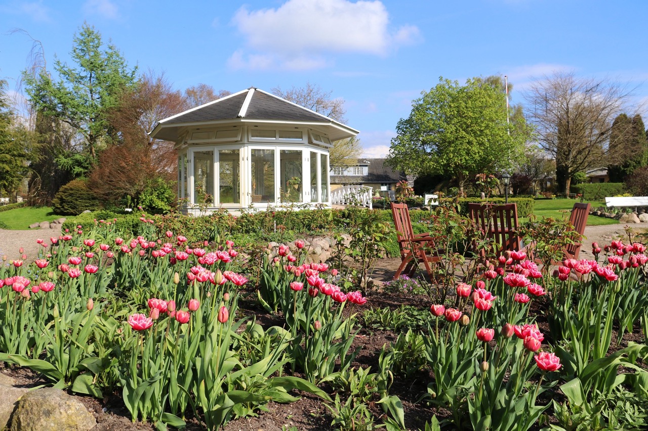 Dansk/engelske have, den prægtige Præriehave, Klosterhaven med lægeurter og den unikke permakulturhave. I kan spise en lækker frokost i Café Klokkeblomst og kigge ind i den flotte gavebutik.